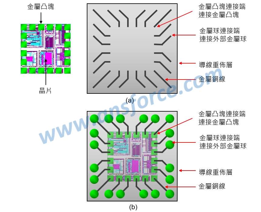由於晶圓級封裝的體積很小,在有限的面積上無法製作太多的金屬接腳(鍚球),一般晶片最上層的金屬凸塊(Bump)都是製作在晶片的四周,因此晶片中央的區域沒有金屬凸塊(Bump),如果要增加金屬接腳(鍚球)數目,最簡單的方法就是利用「導線重佈層(RDL:Re-Distribution Layer)」技術,以導線重佈層將電訊號由晶片四周的金屬凸塊(Bump)向內分散到晶片中央的區域,可以增加金屬接腳(鍚球)數目,如<圖一(a)>所示,由於導線重佈層是由外向內散佈,所以稱為「扇入型(Fan-in)」。