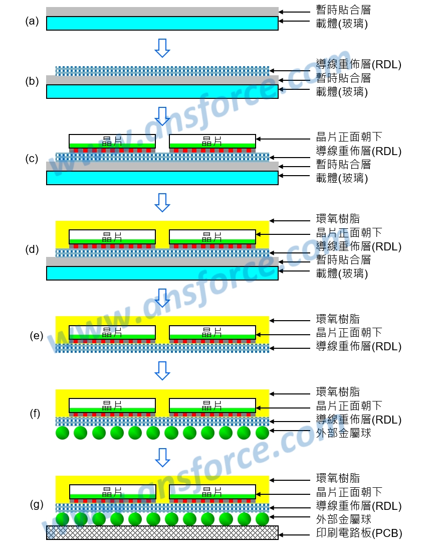 扇出型晶圓級封裝(FOWLP)必須使用「載體(Carrier)」固定晶片,最常使用的載體是「玻璃(Glass)」,因為玻璃成本較低又容易切割,詳細製作流程如<圖三>所示: