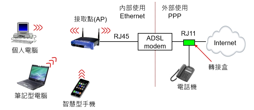 IEEE802.11無線區域網路的架構如<圖一>所示,由於目前大部分的家庭用戶都是使用ADSL連接網路,先將RJ11電話線連接到室內的ADSL數據機,再使用RJ45網路線連接到無線區域網路「接取點(AP:Access Point)」,當我們向中華電信申請ADSL時會贈送一台ADSL數據機,目前大部分的ADSL數據機都直接內建接取點(AP),這裡的接取點(AP)就像是前面介紹無線通訊的微型基地台一樣,最後以無線的方式與電腦內的無線網路卡、筆記型電腦、智慧型手機等行動裝置連接,由於無線的部分使用ISM頻帶,所以不需要任何費用,使用者只需要支付ADSL固定網路的費用即可,這也是它成功的主要原因。