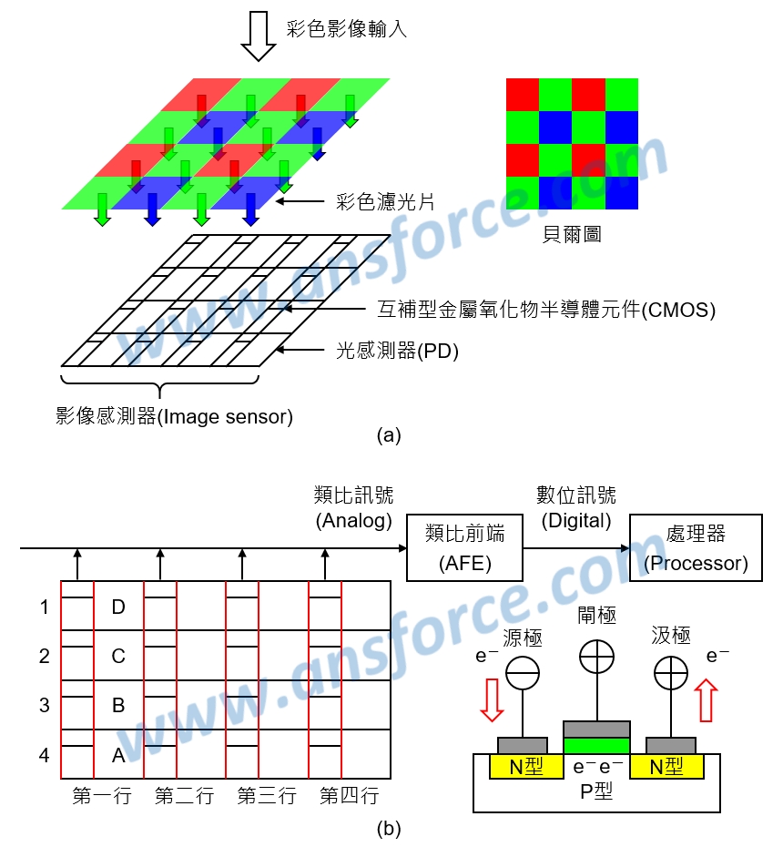 互補型金屬氧化物半導體(CMOS)是一種開關元件,利用閘極施加正電壓在下方形成電子通道,可以便電子由源極流入,由汲極流出,如<圖二(b)>所示,每一個畫素的左上角都有一個CMOS開關,一個一個畫素可以依序打開(ON)導通,使光感測器內的電子依序流入水平線,第一行的電子流完,再流第二行,再流第三行,依此類推,必須把影像感測器內每一個畫素的電子依序流到水平線,經由「類比前端(AFE)」將類比訊號轉換成數位訊號,也就是影像的「類比數位轉換器(ADC)」,再輸入處理器(Processor)進行數位訊號處理。知識力www.ansforce.com。