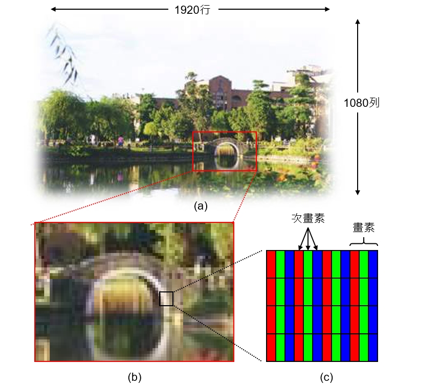 影像顯示器(Image display)的每一個畫素要顯示一種顏色,必須利用光的三原色,也就是紅(R)、綠(G)、藍(B)不同亮度排列組合而成。例如:高畫質(FHD:Full High Definition)為1920行x1080列(大約200萬畫素),如<圖三>所示,由於影像顯示器的每一個畫素必須再切割成RGB三個次畫素,因此實際上FHD顯示器總共有600萬個次畫素,經由控制紅(R)、綠(G)、藍(B)的亮度,排列組合成某一個畫素的顏色。