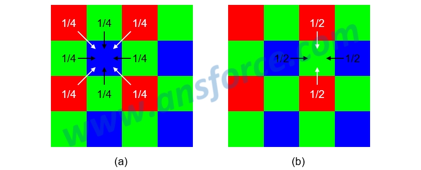 影像感測器(Image sensor)的每一個畫素只能偵測亮度,無法分辨顏色,為了取出顏色,必須在影像感測器上方加「彩色濾光片(Color filter)」,如<圖一(a)>所示,它的RGB排列方式有許多種,目前最常使用的是圖中這種稱為「貝爾圖(Bayer pattern)」。有沒有發現影像感測器的每個畫素只有一種顏色,但是影像顯示器的每個畫素卻有三種顏色,怎麼辦呢?