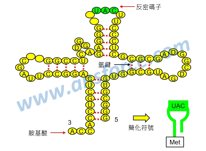 tRNA的構造如<圖一>所示,上方有三個核苷酸稱為「反密碼子」,左下角可以連接一個胺基酸分子,由於tRNA的分子很大,所以科學家通常以簡化符號來代表tRNA分子。