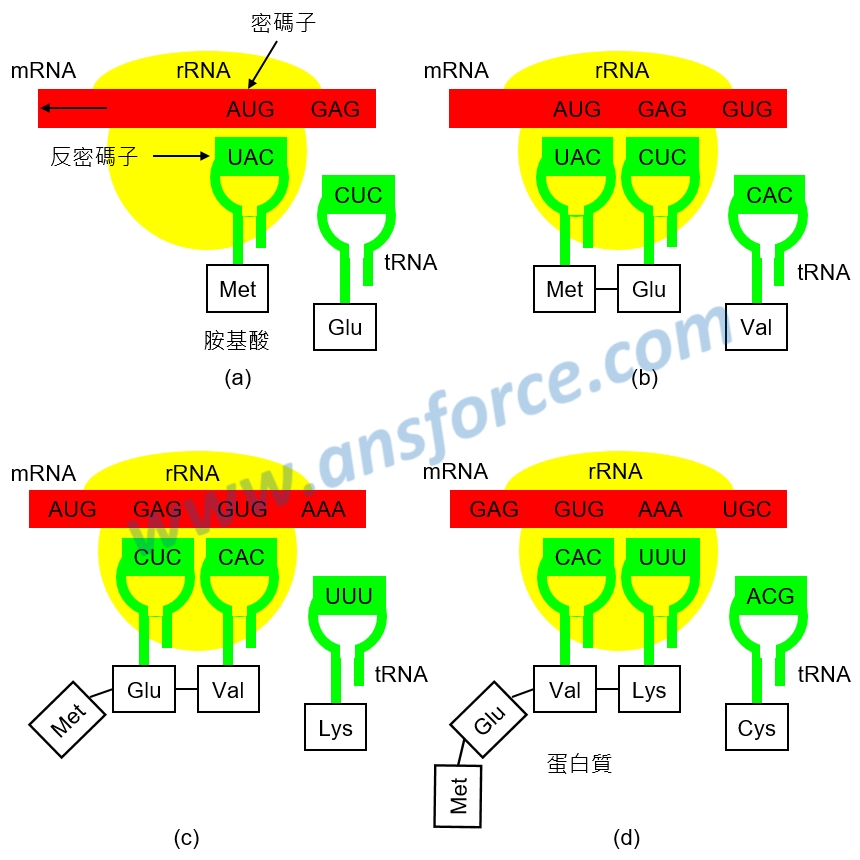 ➤mRNA的第一個密碼子AUG進入核糖體,反密碼子UAC的tRNA靠近,並且將「Met(甲硫氨酸)」帶到核糖體,如<圖三(a)>所示。