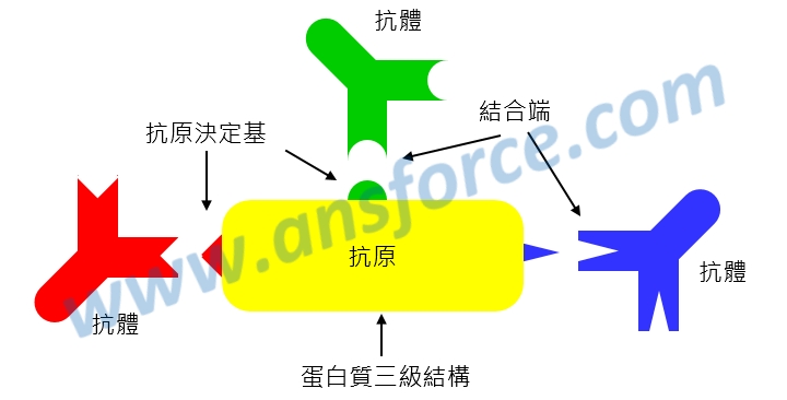 抗原一般都是蛋白質,其中某一小段胺基酸(6個以上)具有特別的立體結構(蛋白質的三級結構),稱為「抗原決定基」,抗原決定基能夠讓生物體的巨噬細胞辨識出來,並且引發生物體產生抗體。一個抗原可能有數個抗原決定基,每個抗原決定基都會引發一種抗體,如<圖一>所示,左邊的抗原決定基是方形,就會引發生物體產生方形結合端的抗體;上面的抗原決定基是圓形,就會引發生物體產生圓形結合端的抗體;右邊的抗原決定基是尖形,就會引發生物體產生尖形結合端的抗體。