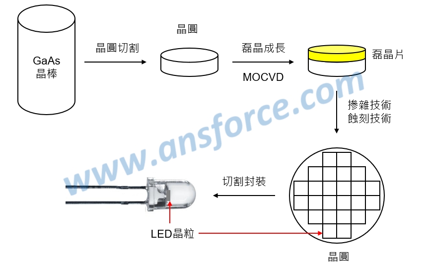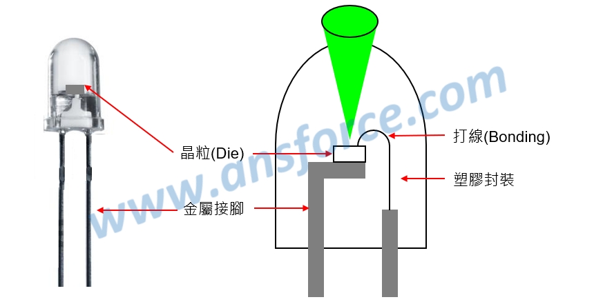 發光二極體(LED)的構造如<圖一>所示,外觀呈橢圓形,尺寸與一顆綠豆差不多,但是真正發光的部分只有圖中的「晶粒(Die)」而已,晶粒的尺寸大約1毫米(mm),與海邊的一粒砂子差不多,這麼小的一個晶粒就可以發出很強的光,由於發光二極體的晶粒很小,所以一片3吋的砷化鎵晶圓就可以製作數千個晶粒,切割以後再打線(Bonding)封裝以塑膠外殼包覆起來,發光二極體的製程與矽晶圓的製程相似,都是利用黃光微影、摻雜技術、蝕刻技術、薄膜成長製作而成,但是尺寸比積體電路(IC:Integrated Circuit)還要大了許多,因此製作上並不困難。知識力www.ansforce.com。
