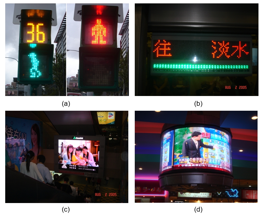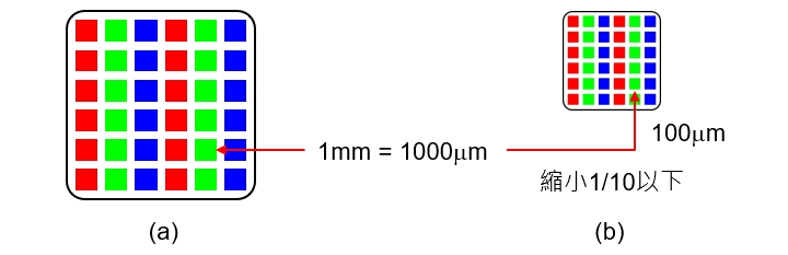 早期的發光二極體晶粒邊長大約1毫米(mm),如<圖三(a)>所示,切割以後只能用來製作單色發光二極體指示牌或是大尺寸的電視牆,如<圖四>所示,後來隨著技術進步,廠商可以切割出晶粒邊長小於1毫米(mm)的「毫發光二極體(Mini LED)」,後來廠商著手開發尺寸更小晶粒邊長小於100微米(μm) 的「微發光二極體(Micro LED)」,如<圖三(b)>所示,人類的頭髮直徑大約100微米,因此Micro LED比人類的頭髮直徑還小,可以應用在中小尺寸面板上,製作出導電性高、耗電量低、發光效率佳、色彩飽和度高的手機面板,造成了整個產業的震撼。目前已經有廠商開發出邊長10微米(μm)以下的晶粒,使用如此微小的LED晶粒可以排列出解析度1500PPI(Pixel Per Inch)的小尺寸面板。