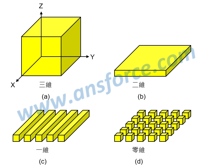 傳統一般尺寸大小的材料我們稱為「塊材(Bulk)」,其結構是在三維空間中的X軸、Y軸、Z軸都可以無限延伸,如<圖一(a)>所示,而奈米材料可以簡單的由外觀的幾何結構分為二維、一維、零維等三種: