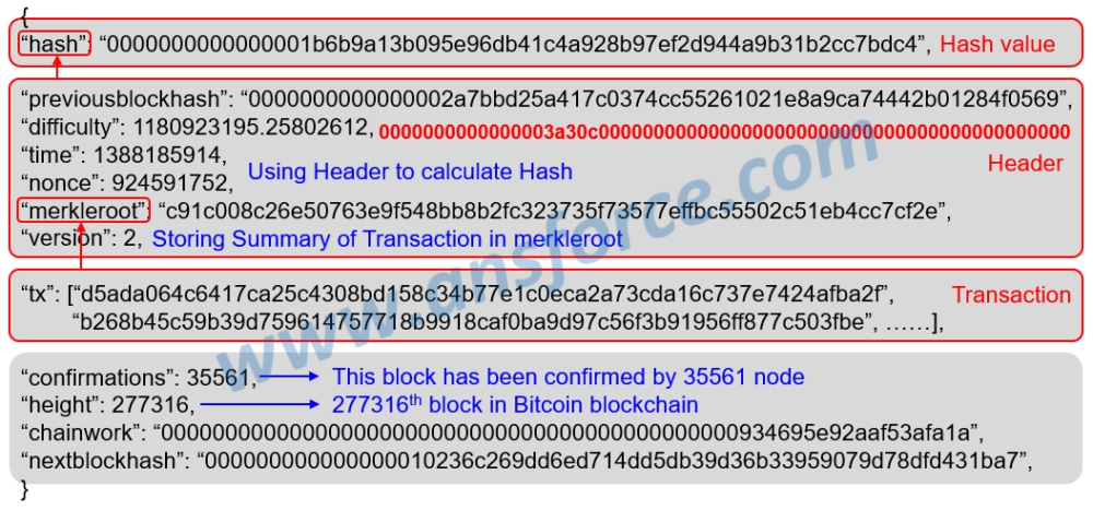 “height”: indicating this block is the 277,316th block in the sequence of bitcoin blockchain