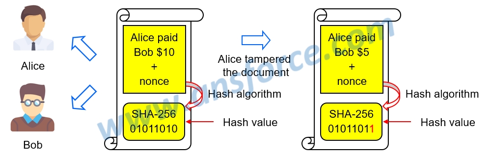 For example, Alice paid Bob 10 dollars. This transaction was recorded in electronic document and both of them possessed a copy. Then, Alice tampered the record as “Alice paid Bob 5 dollars.” Although Alice submitted the original electronic document, both parties might stick to his own version and nobody could judge which copy is the correct version. Therefore, how can we prove Alice had tampered the document? As shown in Fig.3, assuming using Hash algorithm, SHA-256, to calculate the Hash value of electronic document “Alice paid Bob 10 dollars” as “01011010,” if the electronic document had been tampered as “Alice paid Bob 5 dollars,” the Hash value would be “01011011.” We only need to compare the Hash values to confirm if the document had been tampered.