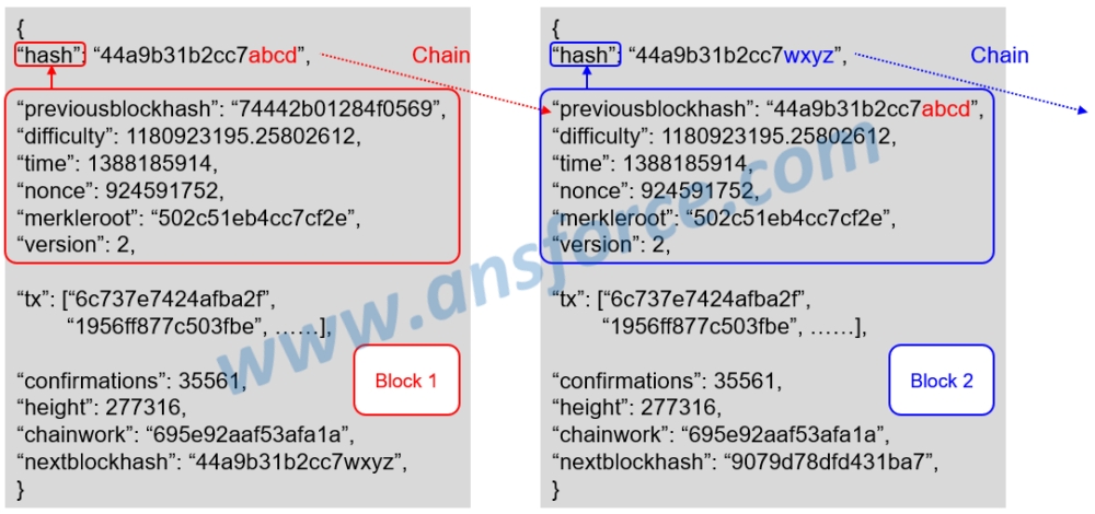 If someone wants to tamper the “Transaction” in Block 1, he has to re-calculate the Hash of Block 1 because the transaction will affect the “merkleroot” in the Header. The Hash of Block 1 is stored in the “previousblockhash” in the Header of Block 2, so the Hash of Block 2 must be re-calculated, and so on.
