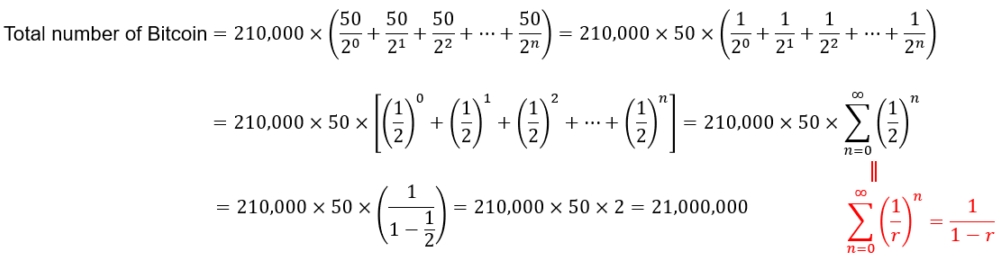 The bitcoin miner can be rewarded 50btc for calculating one block. One block may be mined for about every 10 minutes. The reward will be halved once mining 210K blocks (about four years). Is there anyone tries to figure out why the total number of Bitcoins will not exceed 21 millions (btc)? (Hint: This is actually an infinite geometric sequence!)