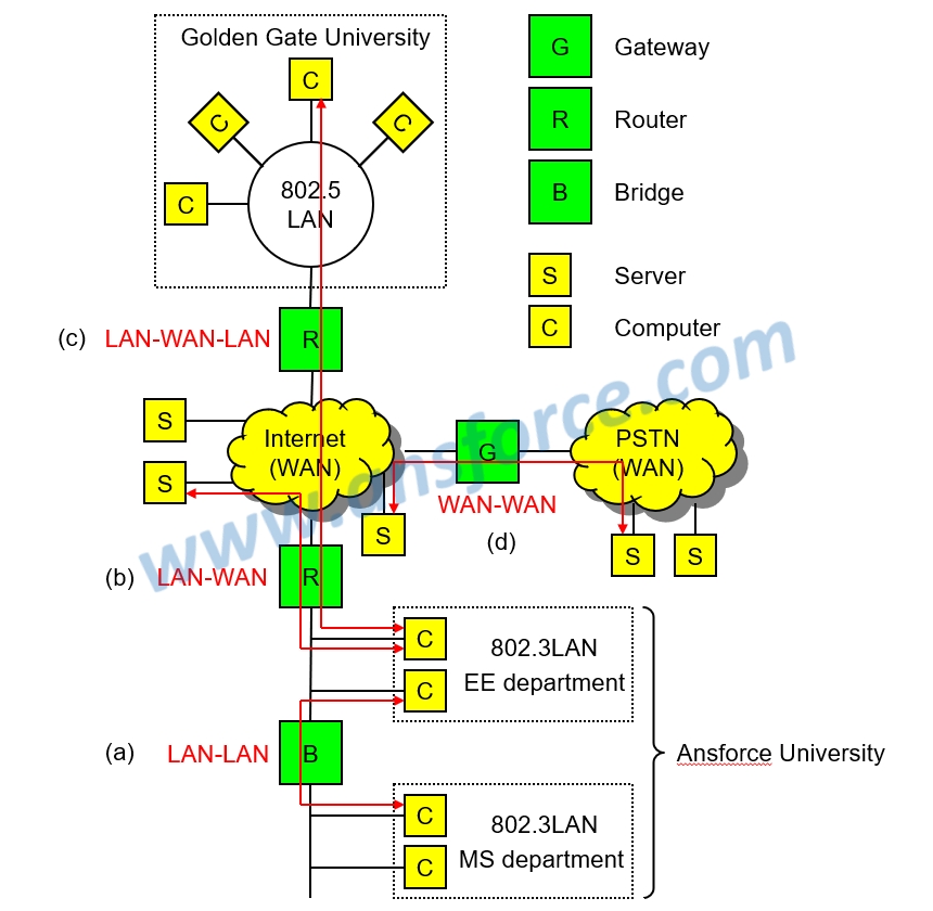 ➤ WAN-WAN: Using gateways to connect two different WANs, such as Internet and Public Switch Telephone Network, as shown in Fig. 1(d).