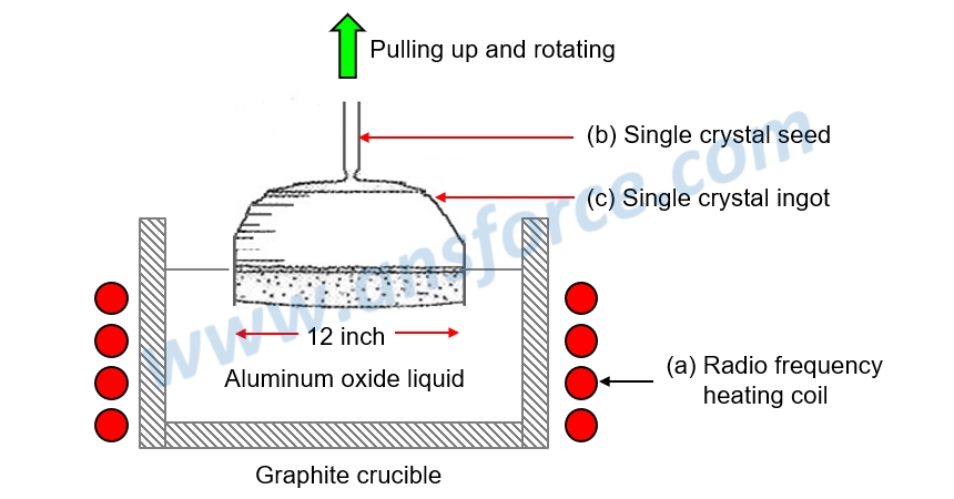 2. Using a small piece of single crystal “seed” to contact the surface of aluminum oxide liquid; pulling up the single crystal seed and rotating; then, the atoms pulled out of the liquid lever will be arranged into a single crystal structure around the seed to slowly form a small section, called “Neck,” as shown in Fig. 1(b).