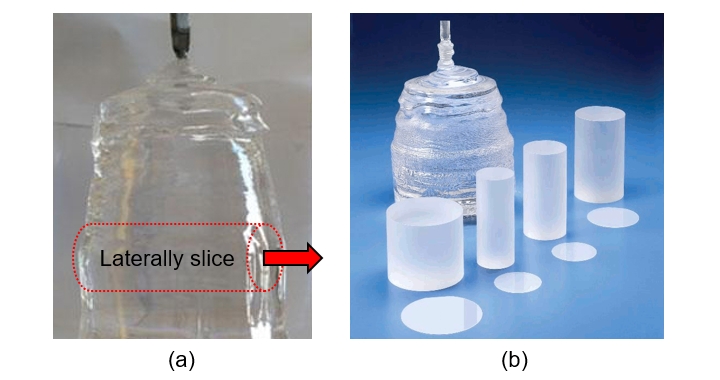 5. Using diamond cutter to laterally slice the solid ingot into round sheets, like slicing a ham; then, polishing the surface to form sapphire wafer, as shown in Fig. 2(b).
