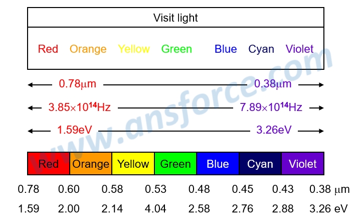 The electromagnetic spectrum is shown in Fig. 1. The visible light with different wavelengths will exhibit different colors for human eyes. The visible light is the light the human eyes may see, and may be approximately divided into seven color blocks, i.e. red, orange, yellow, green, blue, cyan and violet. As shown in Fig. 1, the wavelength of red light is about 0.78μm and the wavelength of violet light is about 0.38μm, so the red light has longer wavelength, lower frequency and lower power, and the violet light has shorter wavelength, higher frequency and higher power. Clearly, the wavelength of light wave is inversely proportional to frequency, and the frequency is directly proportional to energy.