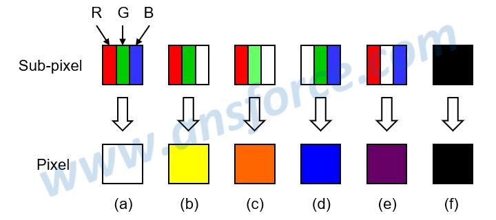 Here are few examples for describing how to combine the three colors, Red (R), Green (G) and Blue (B) in different brightness to form nearly all colors in visible light. Assuming using one square to display one color, this square is called “pixel.” The square may be vertically divided into three small squares to respectively representing red, green and blue colors. These small squares are called “sub-pixel,” as shown in Fig. 2. When the red is in 100% brightness (full bright), the green is in 100% brightness (full bright), and the blue is in 100% brightness (full bright), the three colors will be mixed as white by our vision, as shown in Fig. 2.