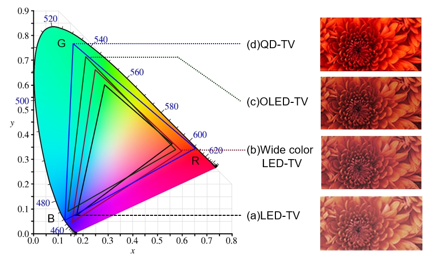 Later, some manufacturers developed different type of WLEDs, which may generate three colors (RGB) with the color filter and enlarge the red triangle on the chromaticity diagram, so as to compose more colors, as shown in Fig. 3(b), which is called Wide Color Gamut LED-TV. These two types of TVs both utilize the color filter to filter out white light to generate three colors (RGB). However, the colors of WLED applied for industrial backlight source are currently still limited, so the composed colors are still not enough. It can be seen in the figure that the three colors (RGB) generated by Organic LED (OLED) TV may compose larger green triangle, so that it can exhibit more colors, as shown in Fig. 3(c); and, the three colors (RGB) generated by Quantum Dot TV (QD-TV) may compose an even larger blue triangle, so that it can exhibit more colors, as shown in Fig. 3(d).