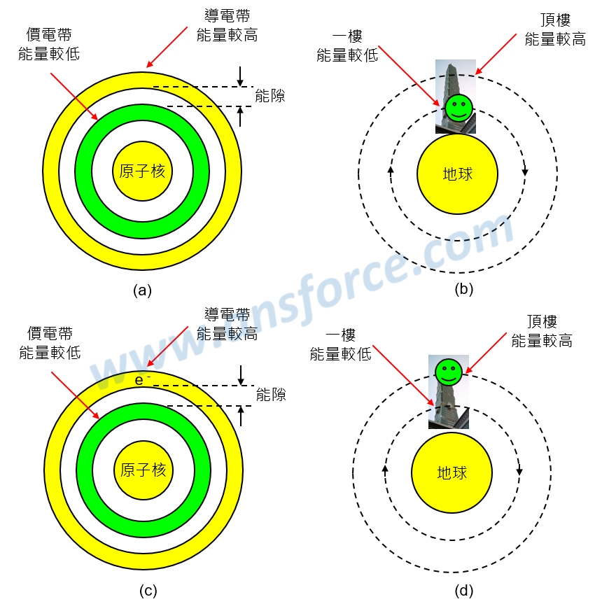 科學家們將電子可以存在半導體中,並且繞原子核運行的區域稱為「能帶(Energy band)」,半導體的能帶可以分為「價電帶(由內層能階集合起來形成)」與「導電帶(由外層能階集合起來形成)」,如<圖二(a)與(c)>所示。我們可以將電子在半導體的價電帶與導電帶的行為,想像成某甲在大樓的一樓與頂樓,如<圖二(b)與(d)>所示。知識力www.ansforce.com。