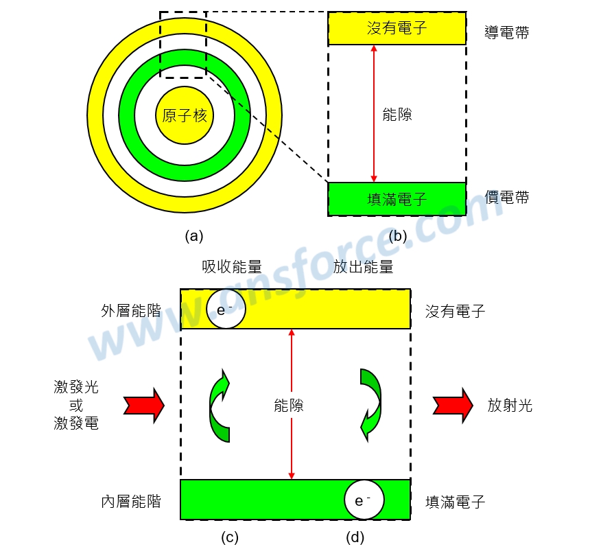「1個矽原子」有1個原子核,原子核外面有1層薄薄的內層能階;而在內層能階的外面則包覆另外1層薄薄的外層能階,如<圖一(a)>所示。「1公克的矽」大約有1023個原子,因此大約有1023個原子核,原子核外面有1023層薄薄的內層能階,更遠的外面則有1023層薄薄的外層能階,科學家們「想像」這1023個原子核是集中在這塊矽固體的正中央形成一個「大原子核」,如<圖一(b)>所示;而1023層薄薄的內層能階集合起來就會形成一層有厚度的能帶(Band),稱為「價電帶(Valence band)」;1023層薄薄的外層能階集合起來就會形成一層有厚度的能帶(Band),稱為「導電帶(Conduction band)」,如<圖一(b)>所示。看到這裏,大家有沒有開始覺得科學家們的「想像力」實在太豐富了呢?這種說法雖然聽起來有點不合理,卻是目前被科學家們廣泛接受的半導體材料發光原理模型了。
