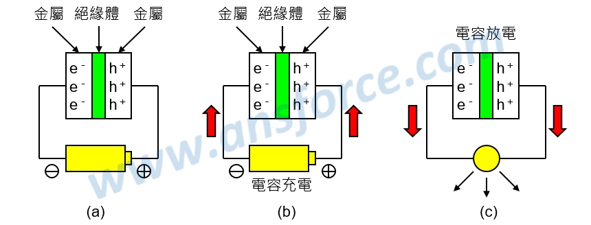 電容的構造如<圖一(a)>所示,通常中央使用一層絕緣材料(塑膠或陶瓷)夾在兩層金屬電極之間。當電容兩端分別連接電池的正極與負極時,電子由負極注入電容,電洞由正極注入電容,電容中央的絕緣層(塑膠或陶瓷)又稱為「介電質(Dielectric)」,電子與電洞注入電容後隔著絕緣層遙遙相望卻無法相通,電子與電洞不斷地注入以後會累積在絕緣層兩端,就好像是將電子與電洞「儲存」在電容內一樣,如<圖一(b)>所示,這個動作稱為「充電」;此時若將電池去除,而用金屬導線將電容兩端的金屬電極連接到某一個元件(例如:燈泡),則原先儲存在電容的電子與電洞就會向外流出,如<圖一(c)>所示,這個動作稱為「放電」,這時的電容不是好像一個小電池一樣嗎?