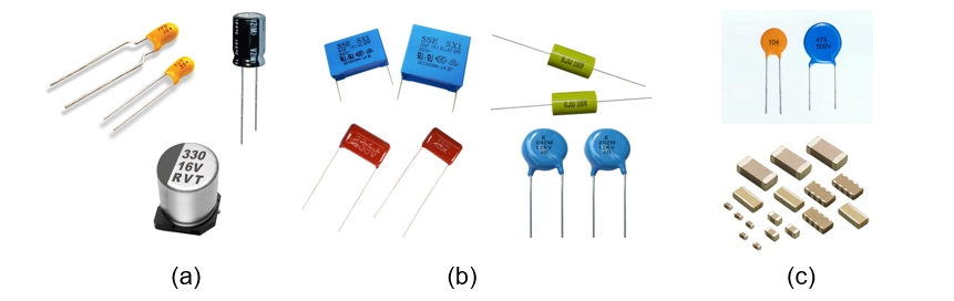 ➤ 塑膠電容:由金屬構成電極,塑膠薄膜做為絕緣層,電容量比較大,例如:聚乙酯、聚丙烯、聚笨乙烯、聚碳酸酯薄膜電容等,如<圖二(b)>所示。