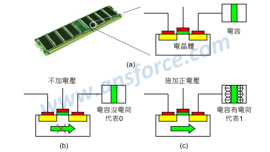 在積體電路(IC)內,電容是非常重要的被動元件,特別是應用在記憶體中,一般是將積體電路中微小的金屬導線連接一層絕緣體,來暫時儲存電荷。DRAM使用一個電晶體(CMOS)與一個電容來儲存一個位元(bit)的資料(一個0或一個1),如<圖三(a)>所示,當電晶體(CMOS)不導通時沒有電子流過,電容沒有電荷,代表這個位元的資料是0,如<圖三(b)>所示;當電晶體(CMOS)導通時(在閘極施加正電壓),電子會由源極流向汲極,電容有電荷,代表這個位元的資料是1,為了要將這些流過來的電荷「儲存起來」,必須使用一個微小的電容,如<圖三(c)>所示,DRAM就是因為電容充電需要時間,所以速度比SRAM還慢。