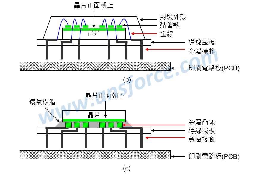 ➤內部覆晶封裝,外部針格陣列(PGA):如<圖二(b)>所示,則可以將金屬凸塊製作在晶片的任何地方(不一定要在四周圍),因此可以容納數目更多的「金屬凸塊」。知識力www.ansforce.com。