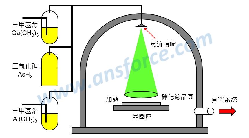 3.將基板加熱到高溫,使三氫化砷化學鍵斷裂產生「砷原子」,三甲基鎵化學鍵斷裂產生「鎵原子」,經由化學反應產生砷化鎵分子。知識力www.ansforce.com。