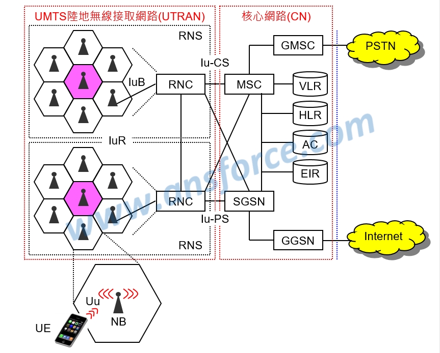 ➤無線網路子系統(RNS:Radio Network Subsystem):由基地台(NB:Node B)與無線網路控制器(RNC)組成,有點類似GSM系統的蜂巢。知識力www.ansforce.com。