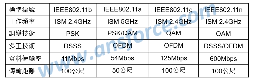 ➤IEEE802.11n:採用2.4GHz的ISM頻帶,使用正交分頻多工(OFDM)與數位訊號調變(QAM),同時支援多輸入多輸出(MIMO)天線,資料傳輸率可達100Mbps,理論上最高可達600Mbps,傳輸距離100公尺。