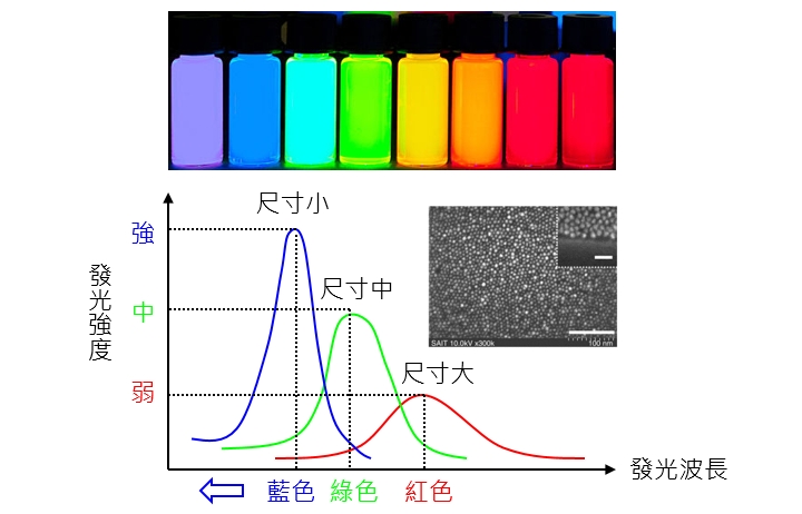 量子局限效應最明顯的特徵是奈米材料的尺寸愈小時,材料發光強度愈強,發光的波長愈短(藍色),這個現象稱為「藍移(Blue shift)」。如<圖一>所示,不同顏色的光波長不同,所以光的波長就是顏色,在可見光中紅光的波長最長,綠光次之,藍光最短,換句話說,當奈米材料的尺寸大,發光強度較弱,顏色為紅光(波長最長);當奈米材料的尺寸變小,發光強度變強,顏色為綠光(波長次之);當奈米材料的尺寸更小,發光強度更強,顏色為藍光(波長最短)。